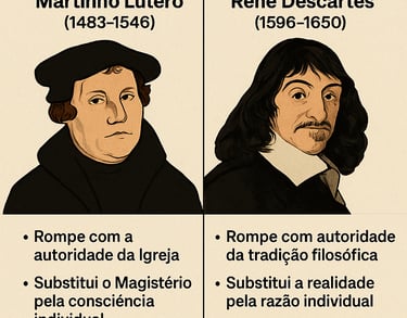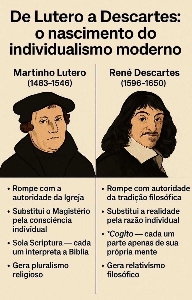 Assim como Lutero fez da consciência individual o árbitro da fé, Descartes faz da razão individual o árbitro da verdade. Ambos inauguram a subjetividade moderna — a ideia de que a verdade nasce de dentro do sujeito, e não de fora, da Revelação ou da realidade objetiva.